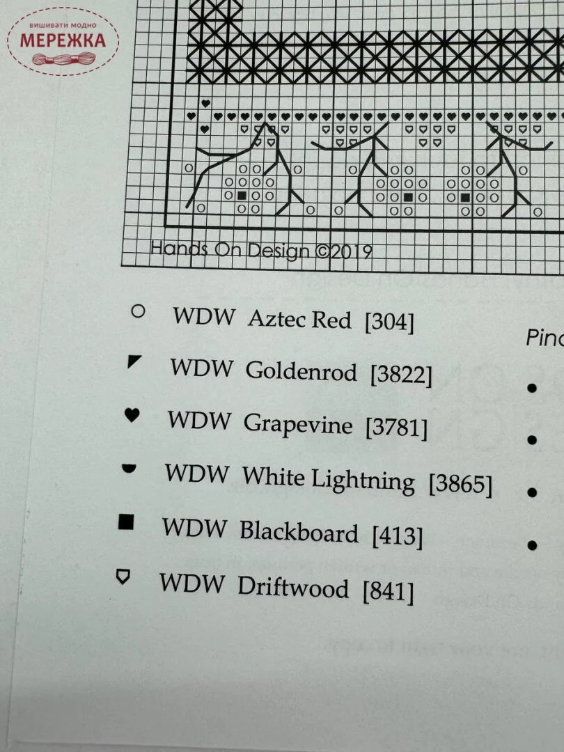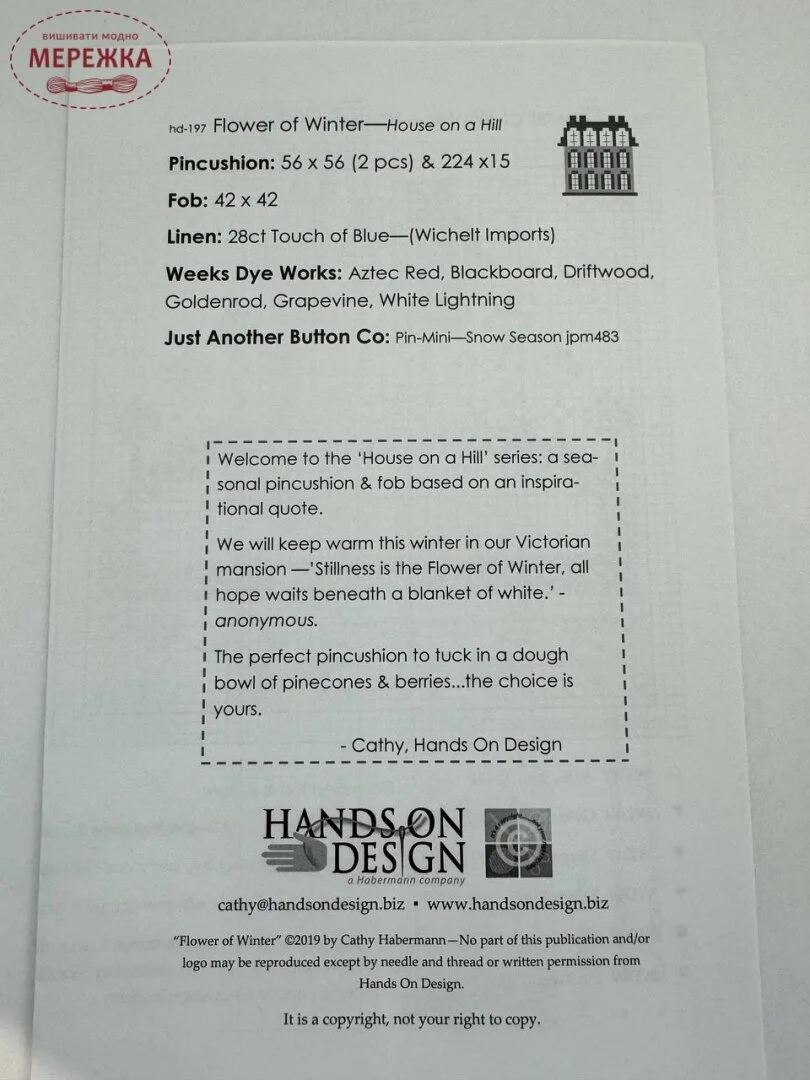 Деякі схеми Hands On Design укомплектовані декоративними елементами від автора - стрічками, відрізами тканин, підвісками тощо. На фото показано потрібні матеріали для вишивання цієї схеми (муліне, тканина, бісер, декоративні елементи).