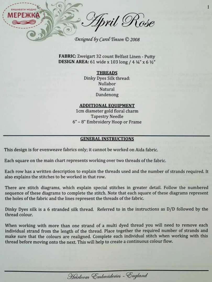 Схема для вишивання від Heirloom Embroideries "April Rose Sampler"+ шовкові нитки