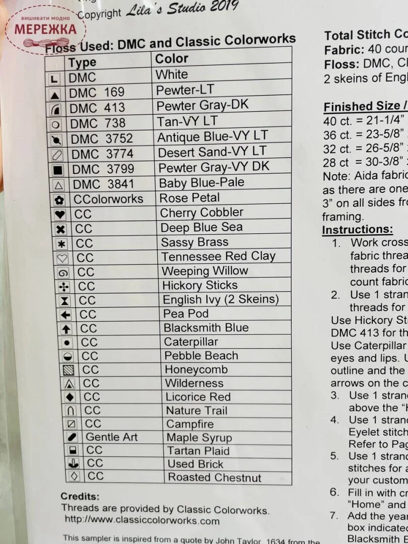 Рекомендовані нитки: DMC Blanc, 169, 413, 738, 3752, 3774, 3799, 3841, Classic Colorworks Rose Petal, Cherry Cobbler, Deep Blue Sea, Sassy Brass, Tennessee Red Clay, Weeping Willow, Hickory Sticks, English Ivy (2), Pea Pod, Blacksmith Blue, Caterpillar, Pebble Beach, Honeycomb, Wilderness, Licorice Red, Nature Trail, Campfire, Tartan Plaid, Used Brick, Roasted Chestnut; The Gentle Art Maple Syrup.