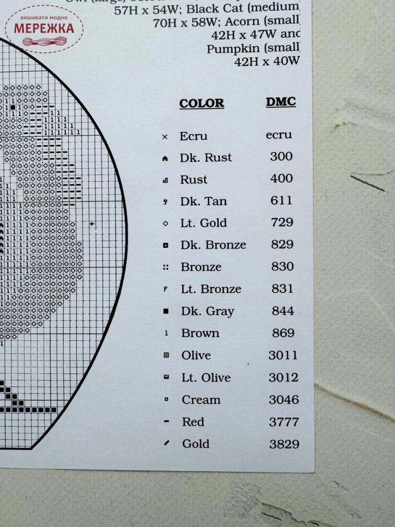 Рекомендована тканина: 32 ct Cognac Zweigart Belfast Linen. Альтернативна тканина: Zweigart Murano 32 ct 3984/4010, Zweigart Belfast 32 ct 3609/326.
