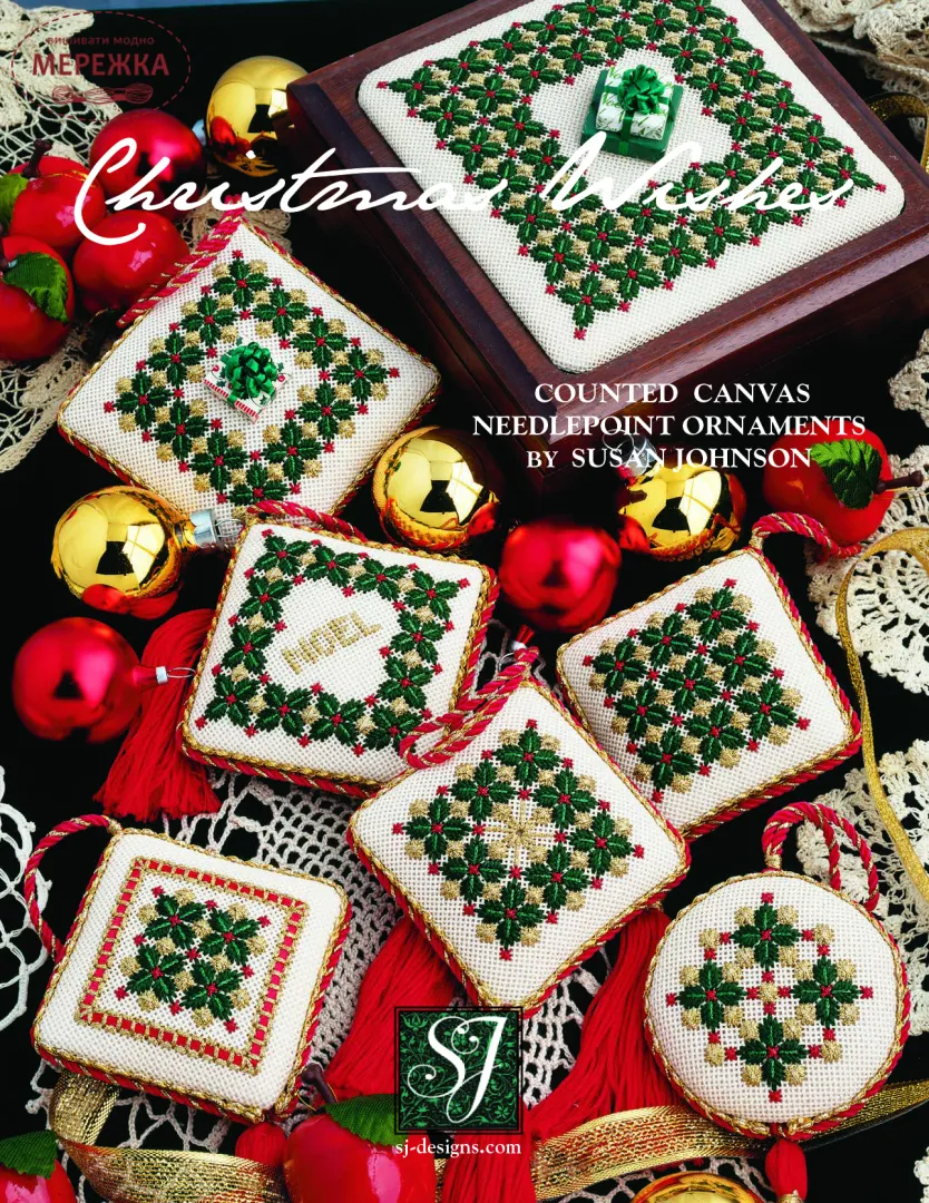 Christmas Wishes — це 7 вишивальних проектів — 6 прикрас розміром від 2-1/4 дюйма до 3-1/2 дюйма та варіація коробки розміром 5 дюймів.