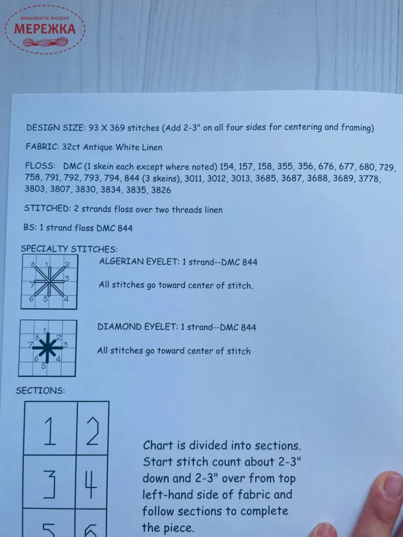 Рекомендовані нитки: DMC 154, 157, 158, 355, 356, 676, 677, 680, 729, 758, 791, 792, 793, 794, 844 (3), 3011, 3012, 3013, 3685, 3687, 3688, 3689, 3778, 3803, 3807, 3830, 3834, 3835, 3826.