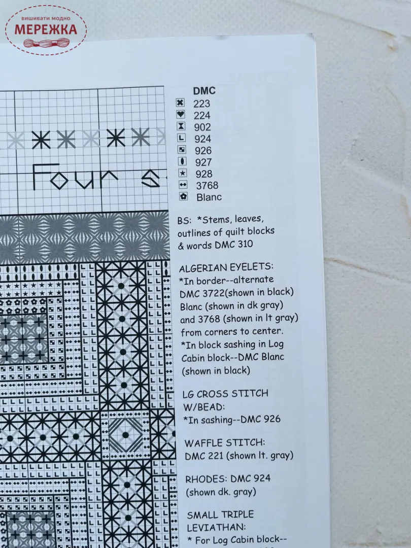 Рекомендовані нитки: DMC 224 (2), 924 (2), 928 (2), Blanc (2), 310 (2), 223, 902, 926, 927, 3768; Kreinik #4 Braid 002.