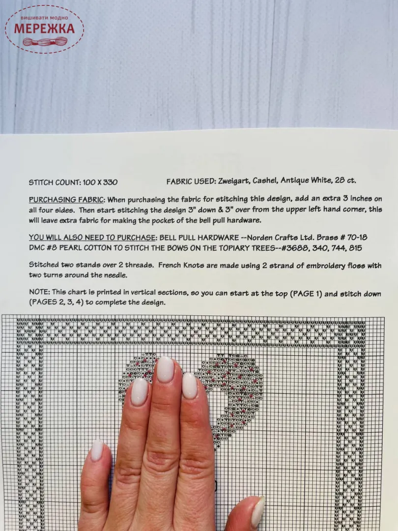 Рекомендовані нитки: DMC 3320, 367, 368, 319, 3721, 3733, 3820, 3821, 355, 3778, 839, 300, 3839, 3838, 3840, 3841, 744, 815, 840, 739, 838, 760; DMC Perle cotton #8 3688, 340, 744, 815.