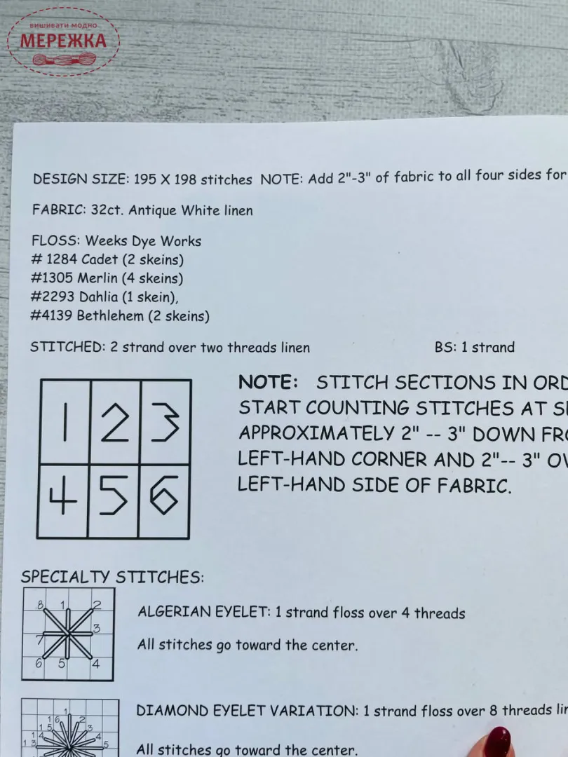 Рекомендовані нитки: WDW 1284 Cadet (2), 1305 Merlin (4), 2293 Dahlia (1), 4139 Bethlehem (2).