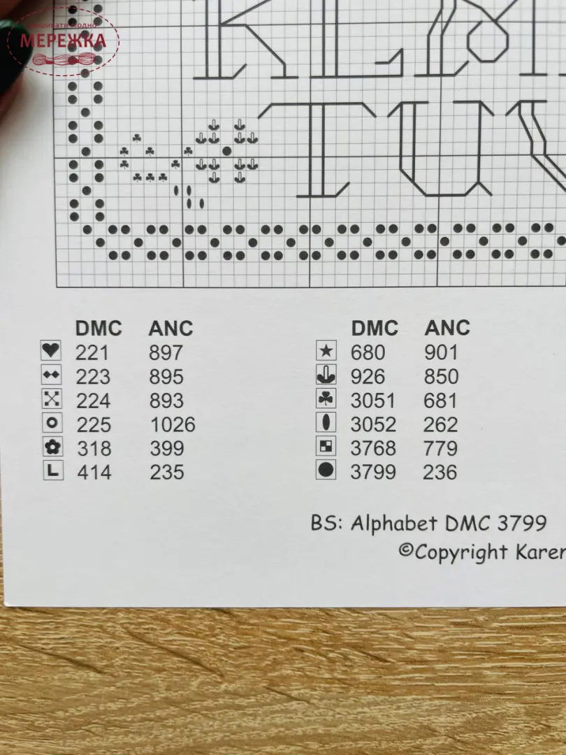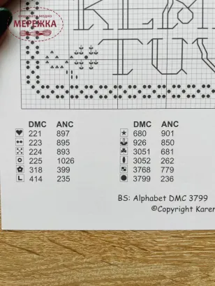 Рекомендовані нитки: DMC 221, 223, 224, 225, 318, 414, 680, 926, 3051, 3052, 3768, 3799.