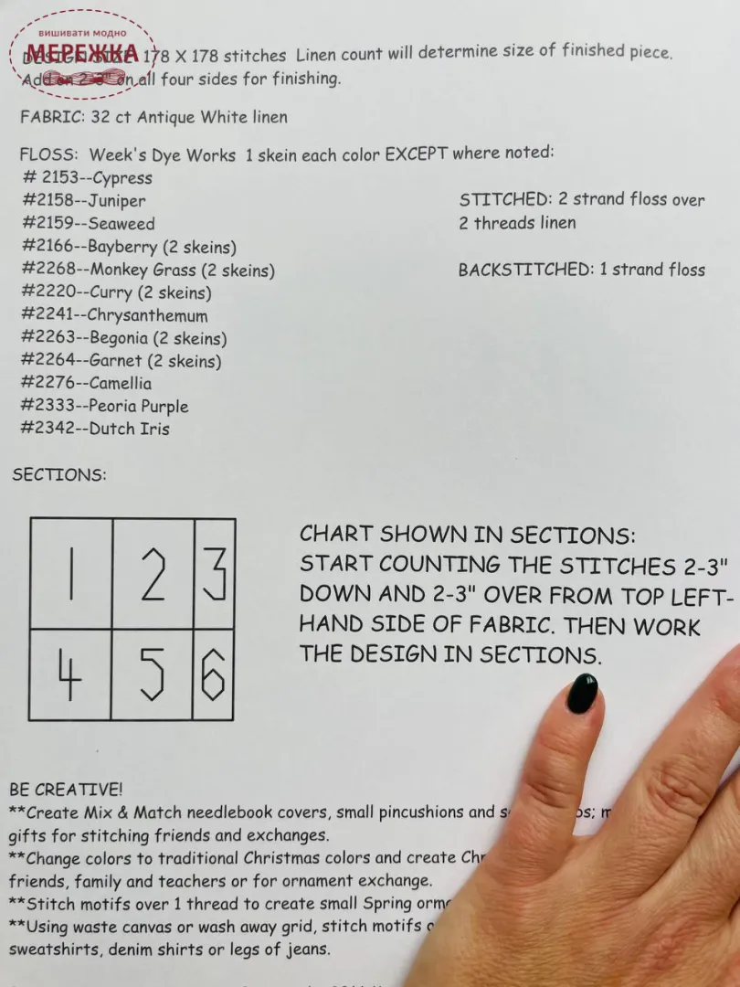 Рекомендовані нитки: WDW 2153 Cypress (1), 2158 Juniper (1), 2159 Seaweed (1), 2166 Bayberry (2), 2168 Monkey Grass (2), 2220 Curry (2), 2241 Chrysanthemum (1), 2263 Begonia (2), 2264 Garnet (2), 2276 Camelia (1), 2333 Peoria Purple (1), 2342 Dutch Iris (1).
