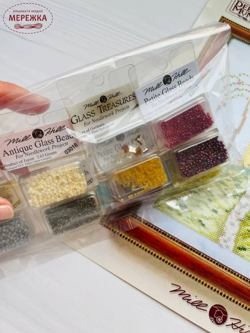 Бісер Mill Hill (в наборі): 00150, 02023, 02046, 02047, 02075, 03016, 42012, 42035, 42037, 12190 (6).