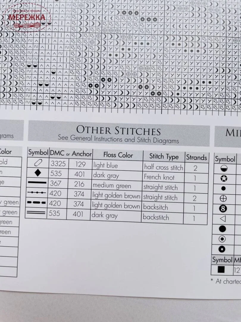 Рекомендовані нитки: DMC Ecru, 221, 300, 301, 367, 415, 420, 535, 610, 772, 816, 833, 834, 898, 918, 3325, 3346, 3348, 3362, 3364, 3776, 3822, 3864, 3865.