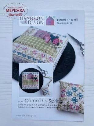 Деякі схеми Hands On Design укомплектовані декоративними елементами від автора - стрічками, відрізами тканин, підвісками тощо. На фото показано потрібні матеріали для вишивання цієї схеми (муліне, тканина, бісер, декоративні елементи).