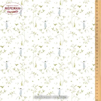 Ця ніжна бавовняна тканина запрошує вас у тиху подорож у пробудження весни. Тонкі світло-зелені вусики звиваються на білому фоні та несуть крихітні квіточки, що сяють, як перші ніжні цятки світла після зими.