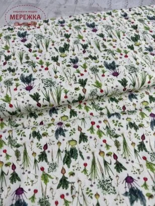 У День подяки ми радіємо плодам поля і дякуємо за щедрий урожай. На цій набивній тканині ми бачимо численні овочі, зображені в невеликих розмірах. Від кольрабі до буряка, часнику та багато іншого. Цю тканину можна чудово використовувати при пошитті домашнього текстилю, такого як подушки, ковдри, доріжки, серветки, кошики та інші текстильні ідеї.