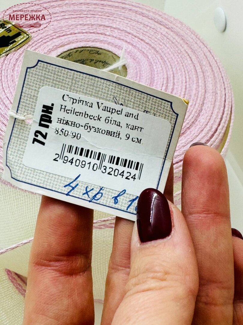 Стрічка Vaupel and Heilenbeck біла, кант ніжно-бузковий, 9 см. 850/90