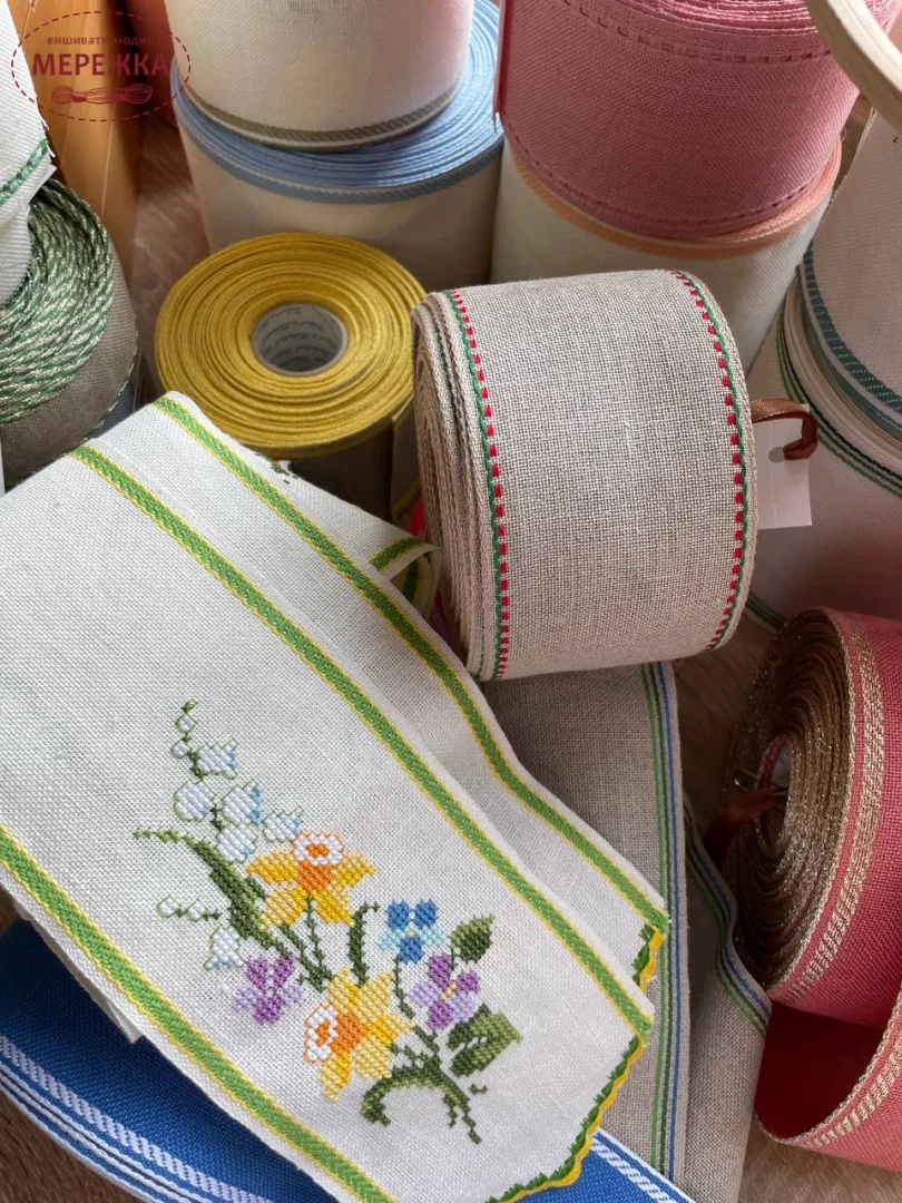 Стрічка виготовлена з рівномірного лляного полотна по якій можна вишивати будь-які дизайни.