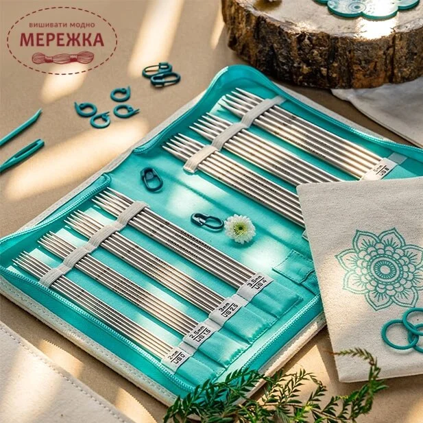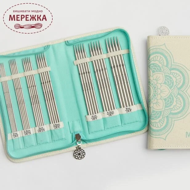 Набір шкарпеткових спиць запакований в симпатичну торбинку із квітковим медитативним мотивом.