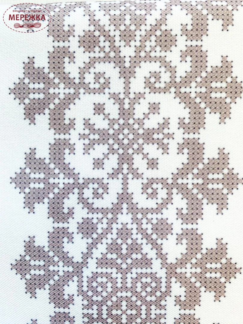 Тканина із нанесеним малюнком-схемою, на котрій дуже легко вишивати, оскільки вона має спеціальні місця для вколювання і виколювання голки, чіткий малюнок. Склад тканини: домоткане полотно (50% поліестеру, 50% котону). Тканина розкроєна на куски розмірами: 140 см.*80 см. - основа, рукави складаються з двох частин: плече - 35см.*50 см., рукав - 70 см.*70 см.