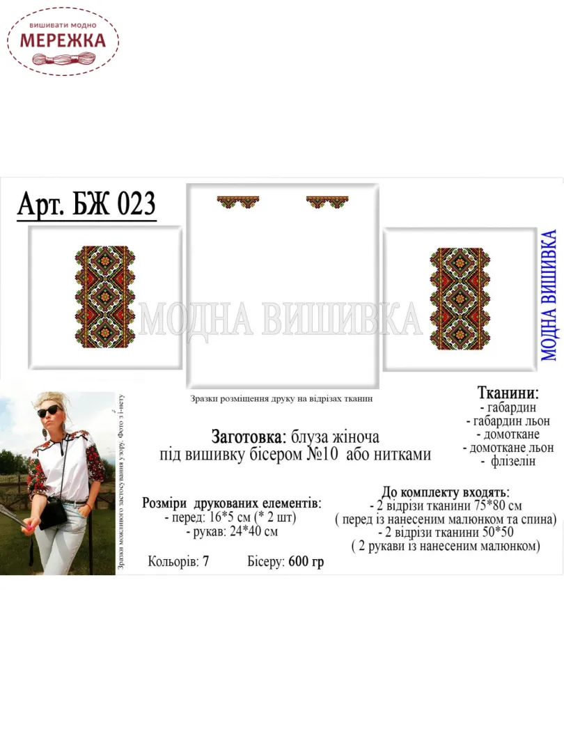 В інструкції зазначена кількість кольорів, котрі використовуються у заготовці для вишивання. Прописані рекомендовані номери бісеру Preciosa (Чехія), ниток DMC (Франція). Також зазначена необхідна кількість бісеру для вишивання в штуках і грамах.