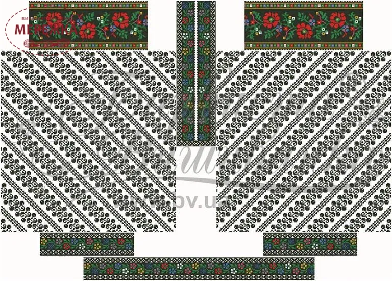 Тканина із нанесеним малюнком-схемою, на котрій дуже легко вишивати, оскільки вона має спеціальні місця для вколювання і виколювання голки, чіткий малюнок. Склад тканини: домоткане полотно (50% поліестеру, 50% котону). Тканина розкроєна на куски розмірами: 140см*120 см - 1 шт, 45см*75см - 2 шт.
