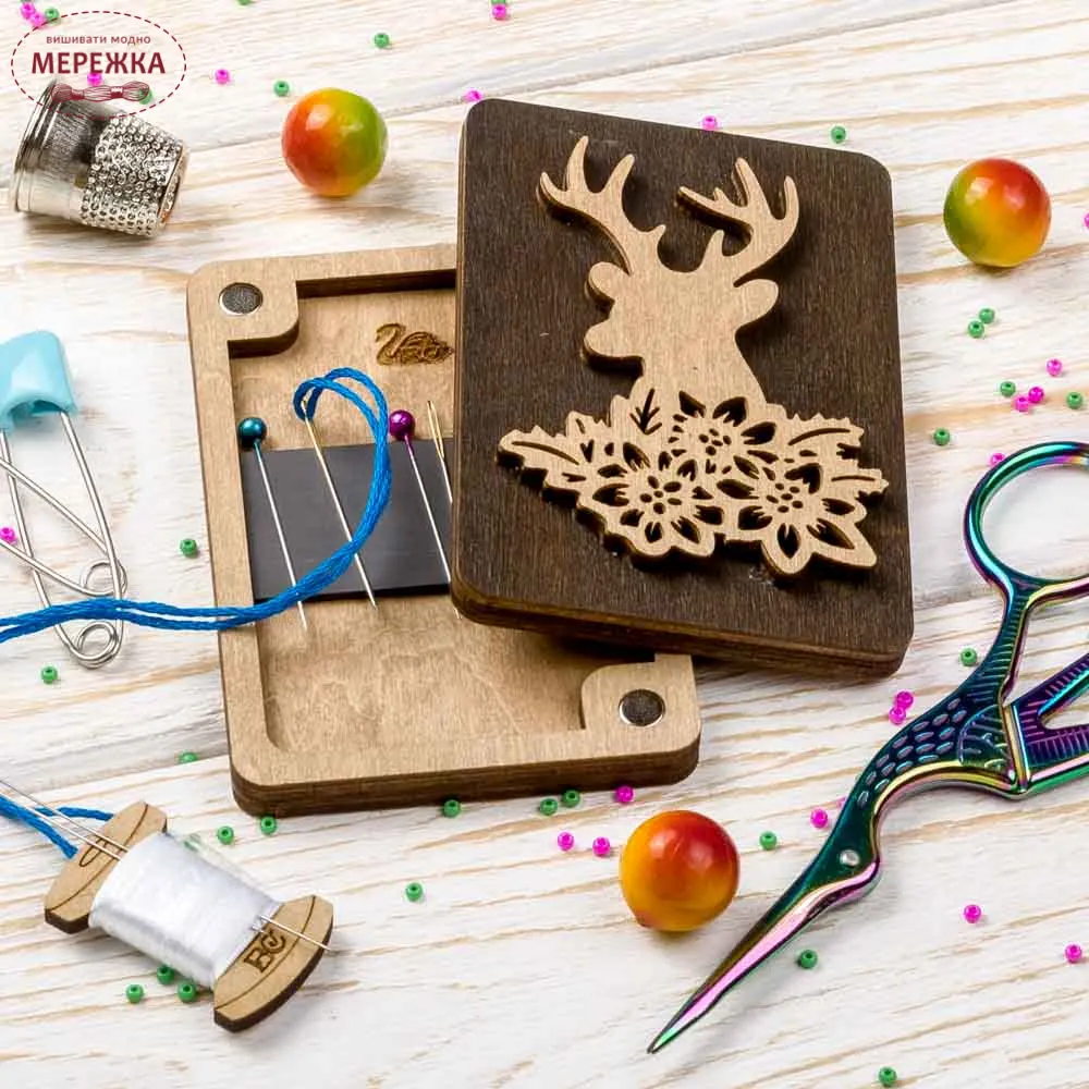 В комплекті вмонтована магнітна стрічка, яка надійно фіксуватиме голки, булавки, шпильки. Голківниця закривається кришкою на магнітах, тож надійно зберігатиме ваші голки. Чарівний дизайн голківниці теж вартий вашої уваги.