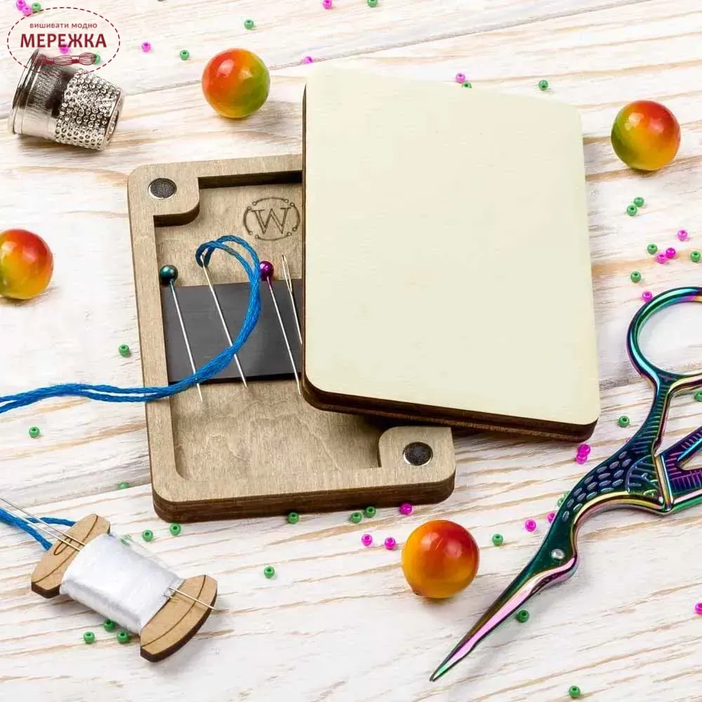 В комплекті вмонтована на дні виробу магнітна стрічка, яка надійно фіксуватиме голки, булавки, шпильки. Скринька закривається кришкою з фанери за допомогою міцних магнитів, тож надійне зберігання голок забезпечене. Чарівний дизайн скриньки теж вартий вашої уваги.