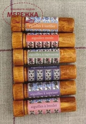 Невеликий дерев'яний футляр для голок, що містить швейні голки у вінтажному стилі. На кришці є надрукований шовкографією чорний Sajou "S", а корпус туби вкритий квітковою етикеткою.
