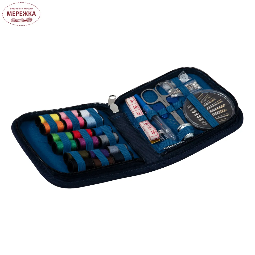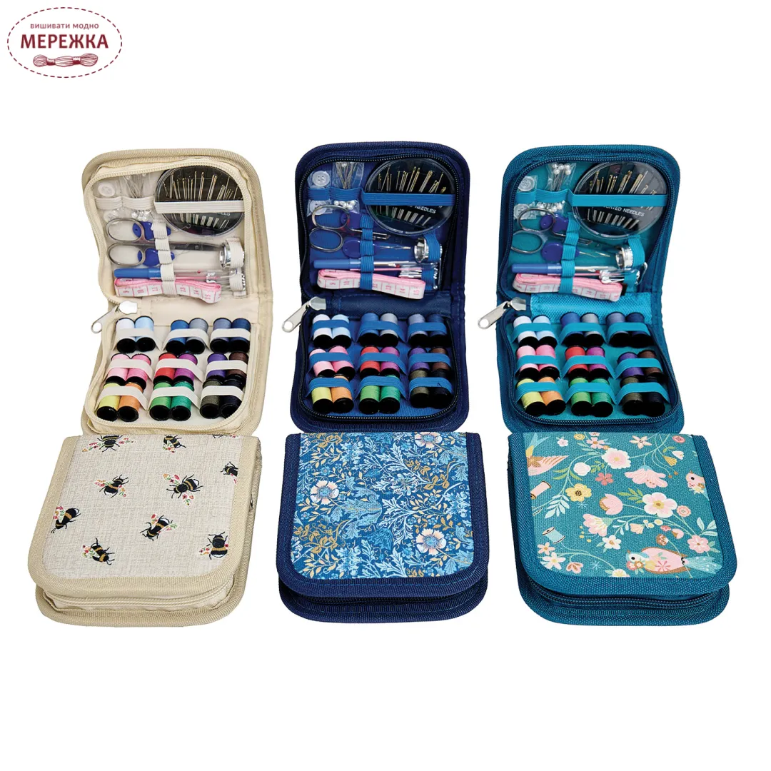 Кожен комплект містить: 3 кнопки; 10 перлинних шпильок; наперсток; голчастий диск (30шт); 2 нитковдевачі; ножиці; 6 шпильок; розпушувач швів; рулетка (150 см) і 18 котушок для ниток.