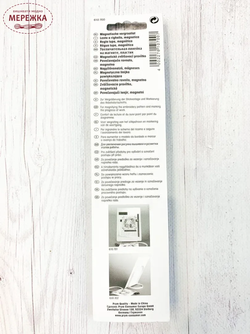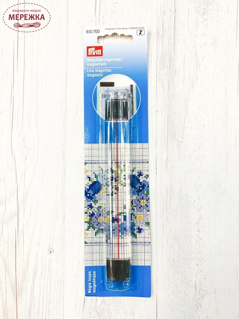 Збільшувальна лінійка для читання схем для вишивання та в'язання. Завдяки червоній лінії можна чітко підкреслити потрібний рядок схеми. Завдяки вмонтованим магнітам легко кріпиться на будь-якій магнітній дошці.