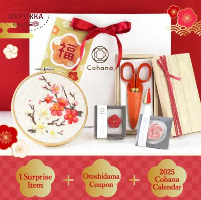 Новорічна сумка Lucky Bag 2025 включає 4 предмети на тему квітів Уме: оригінальний набір для вишивання хрестиком Cohana з малюнком квітів Уме, маленькі ножиці з лакованими ручками в обмеженому кольорі: Ginshu, дерев’яний магнітний тримач для голок «Квітка Уме» та нитковдівач «Квітка Уме» Iida Mizuhiki. На додаток до вищевказаного, включено 1 сюрприз із продуктів Cohana, купон Otoshidama та календар Cohana на 2025 рік.