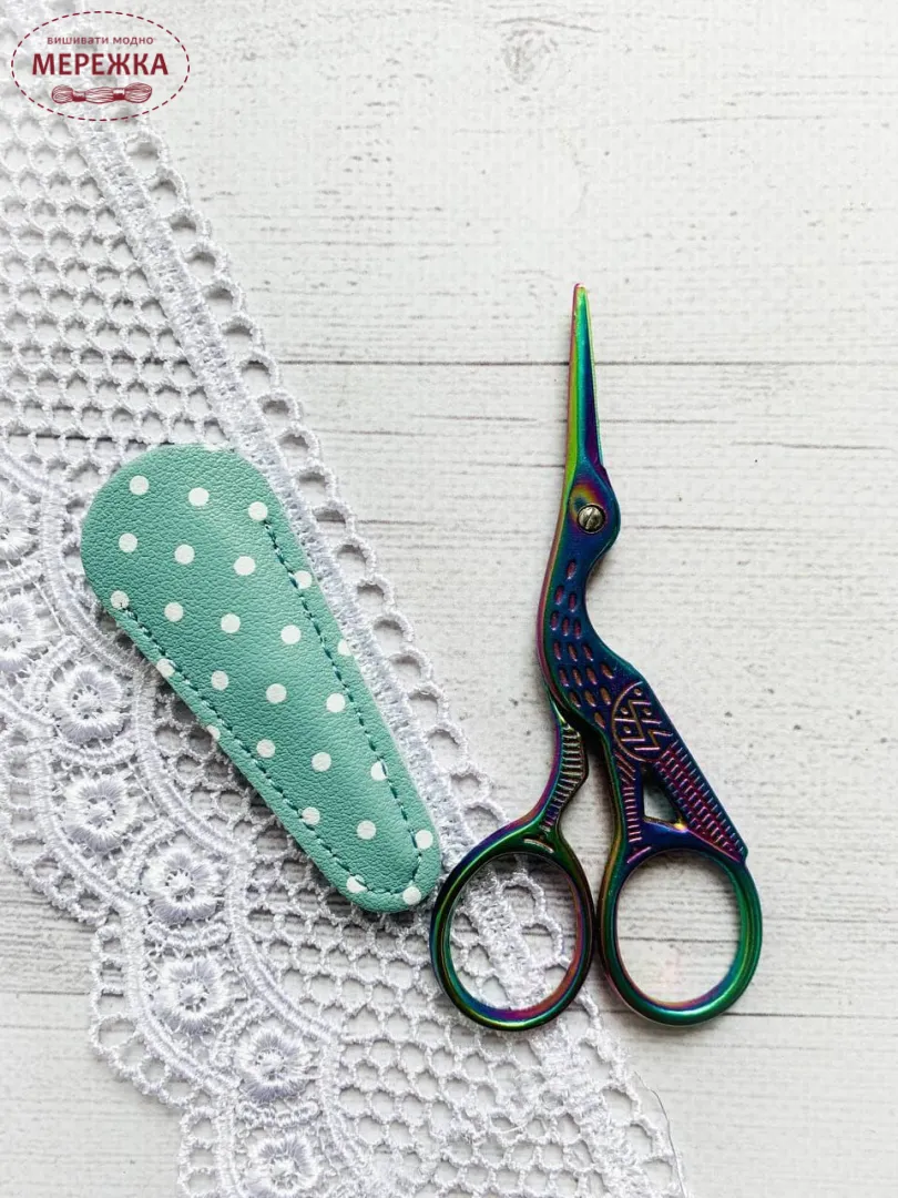 Кольорові ножиці для рукоділля з шкіряним чохлом, який захищає гострі леза.