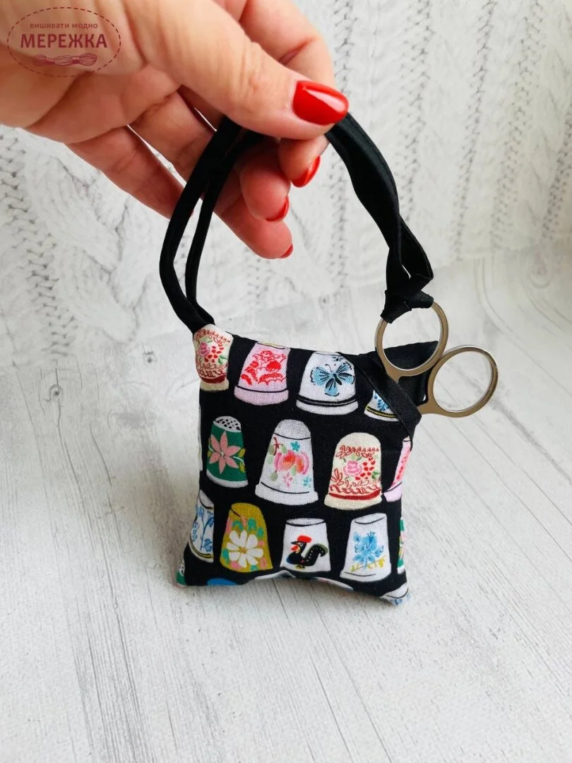 Подушека з бавовняної тканини розміром 10 х 10 х 4 см набита м'яким наповнювачем, що не псує голок.