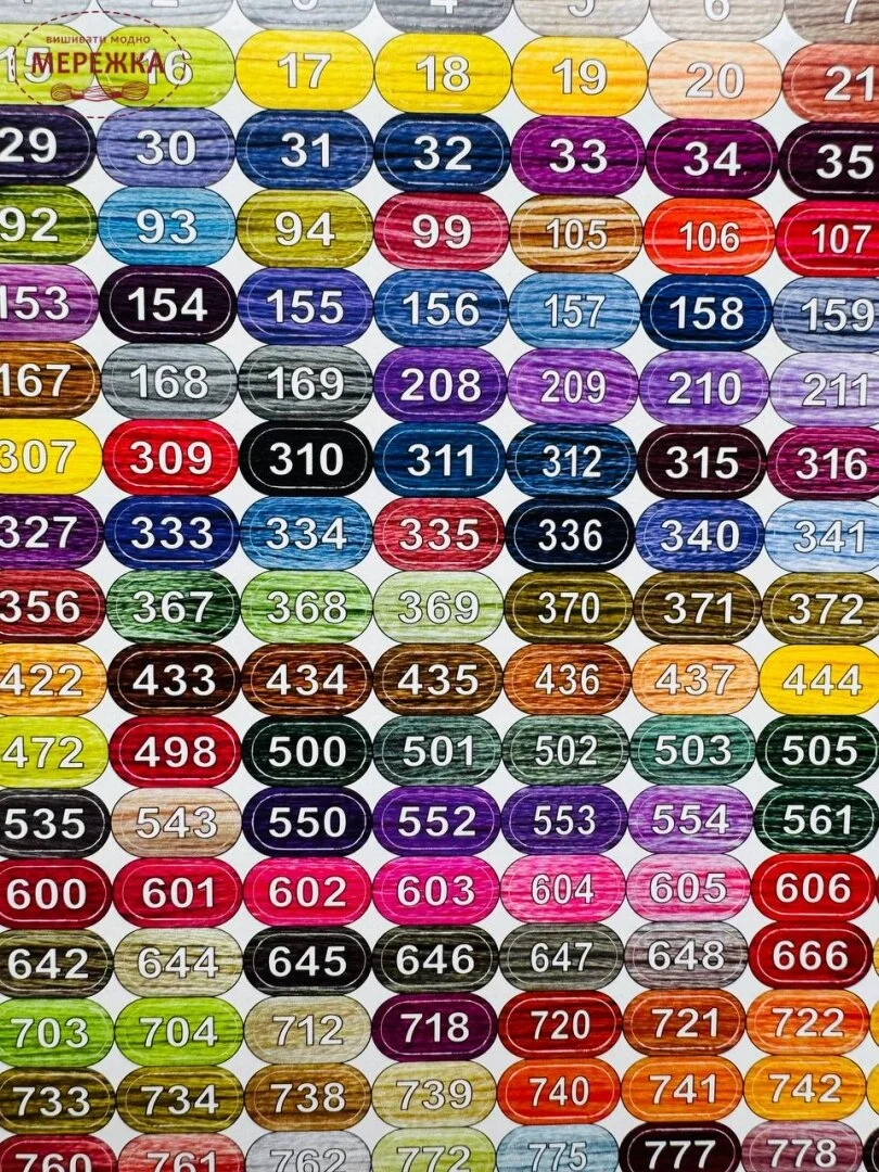 В комплекті наліпки з усією нумерацією муліне DMC.