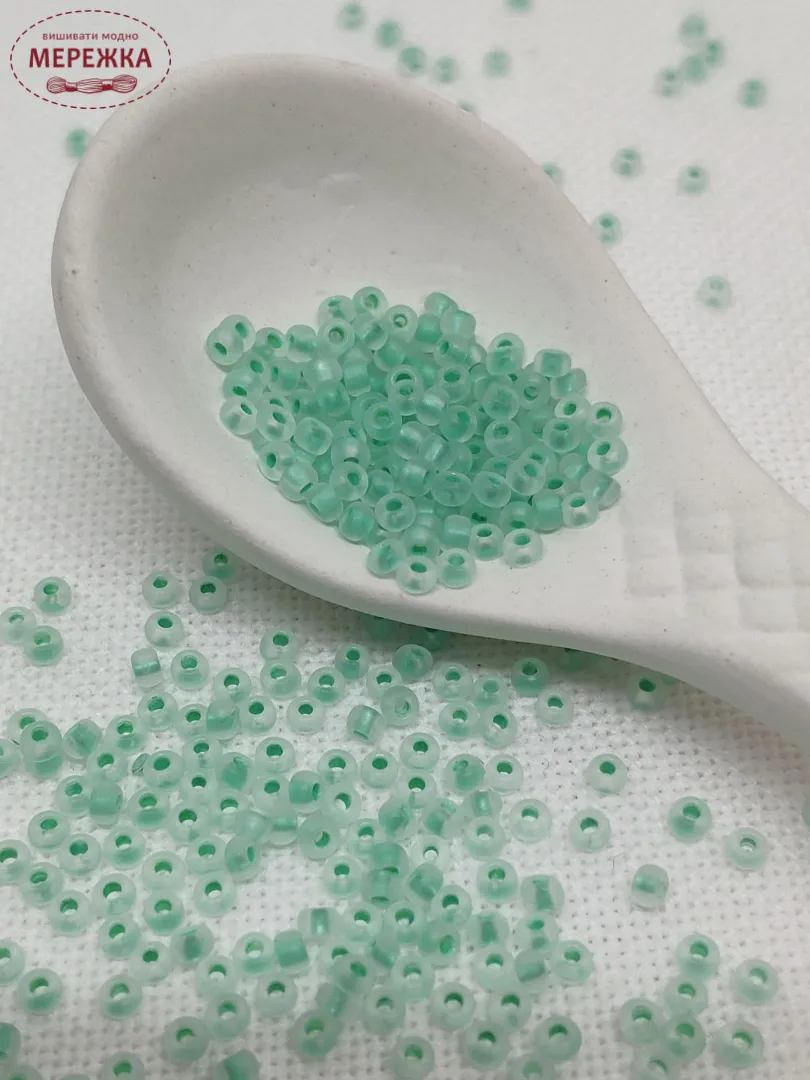 Бісер 38352 зелений, матовий з промальованою зеленою серединкою.