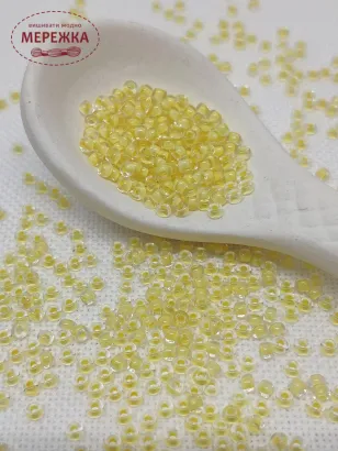 Бісер 38381 круглий, прозорий з промальованою серединкою жовтого кольору.
