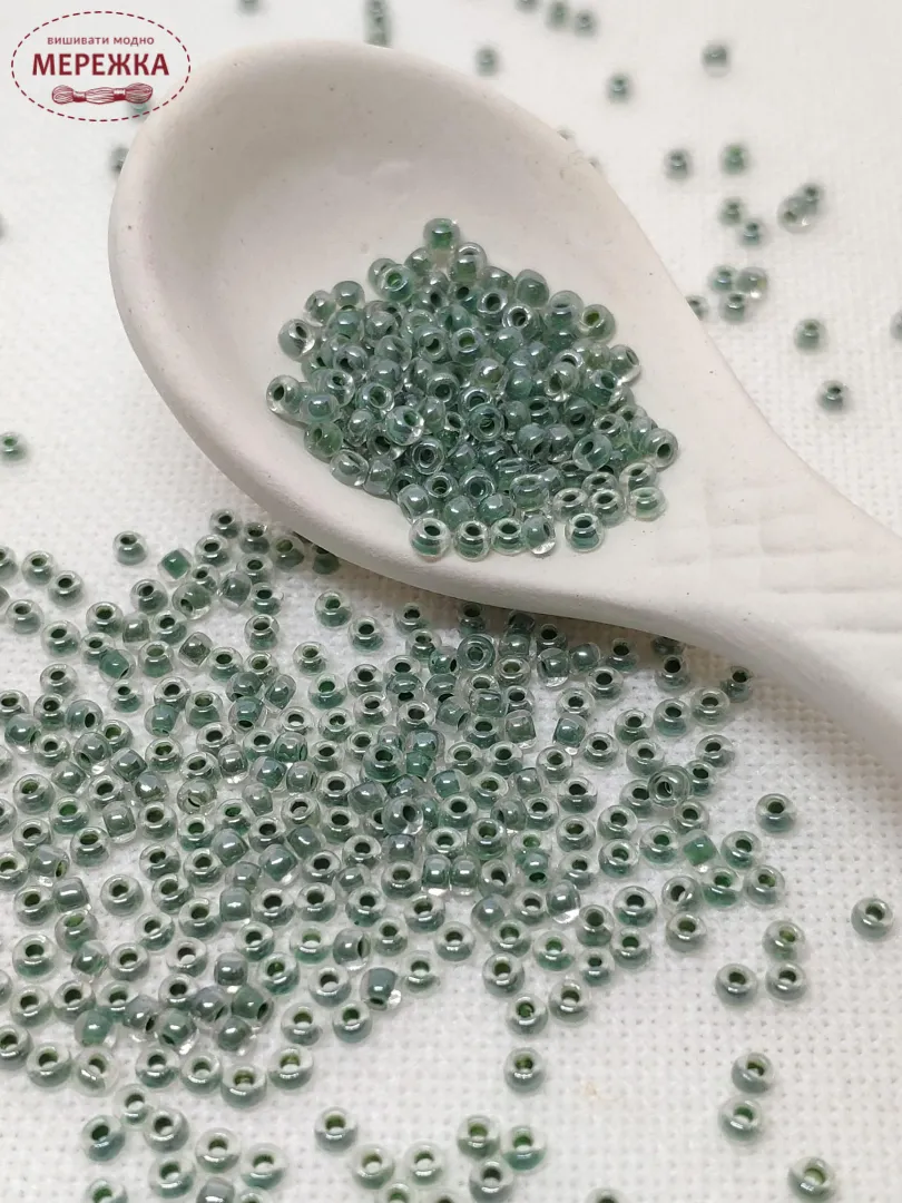 Бісер 38659 круглий, прозорий з промальованою серединкою темно-зеленого кольору.