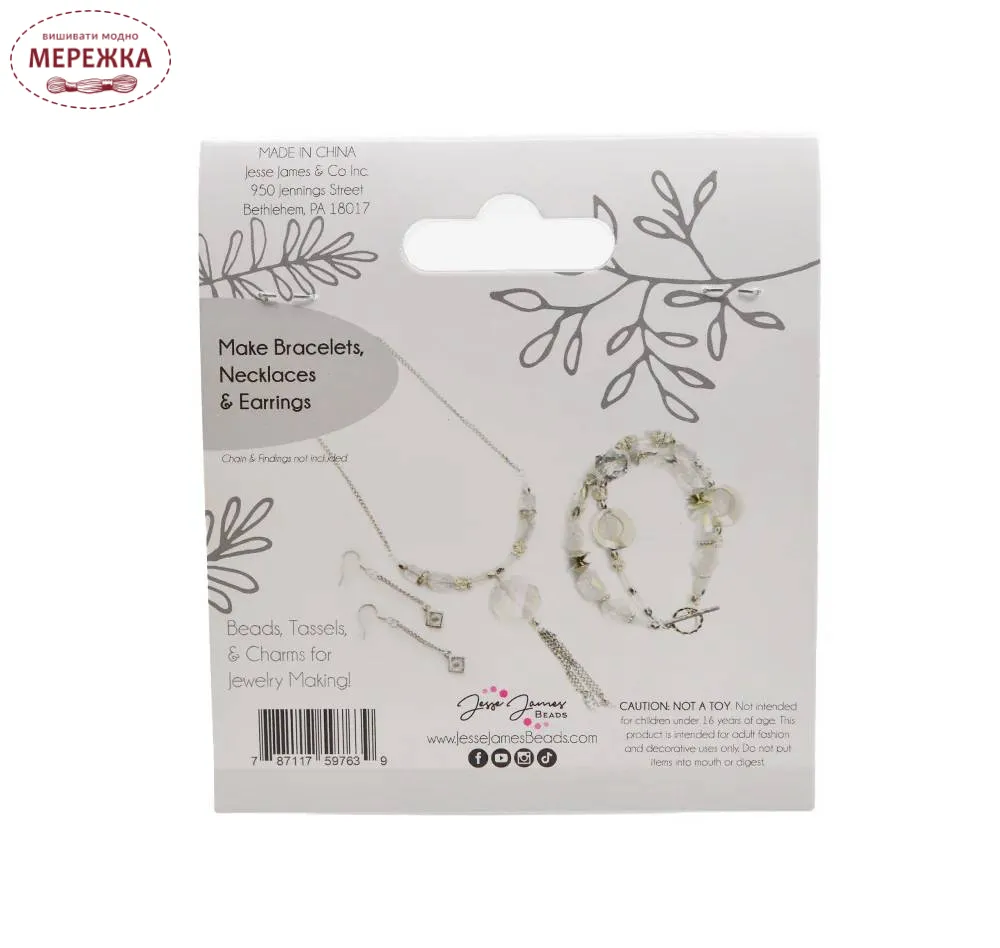 Чарівний набір з різноманітних бусин для створення прикрас у відтінках кришталю і срібла.