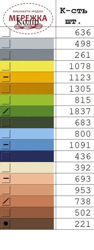 В інструкції зазначена кількість кольорів, котрі використовуються у схемі для вишивання.