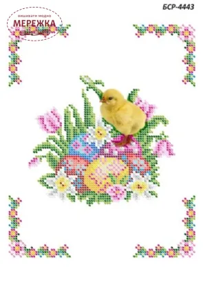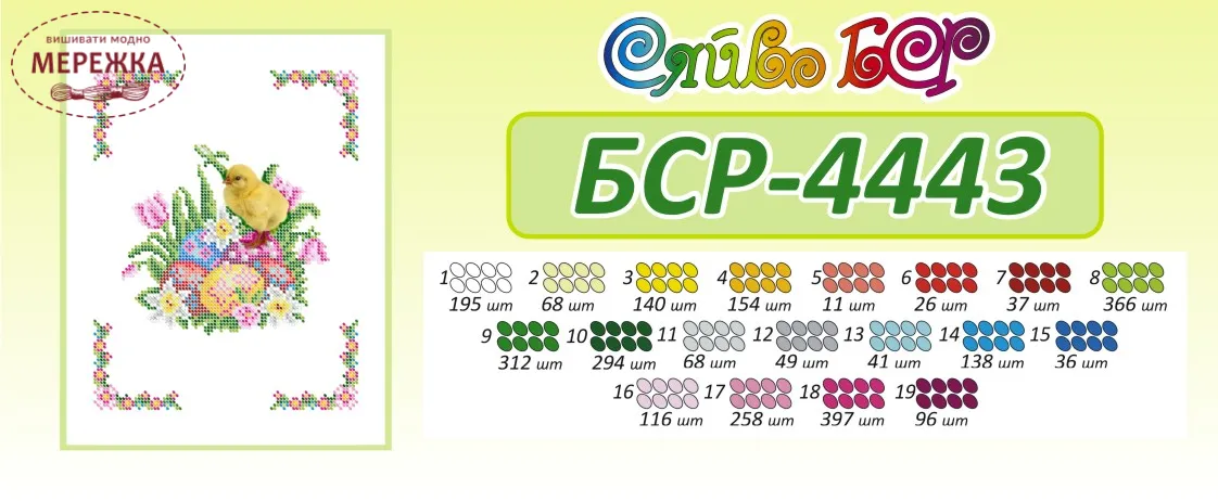 Схема для вишивання бісером великоднього рушника БСР-4443 від виробника "Сяйво". Із зображенням великодніх писанок та курчатка.