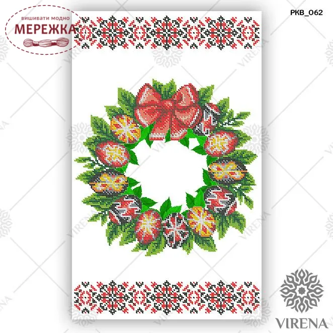 Схема для вишивання бісером великоднього рушника РКВ-062 від виробника "Virena". З зображенням великоднього віночка з крашанками.