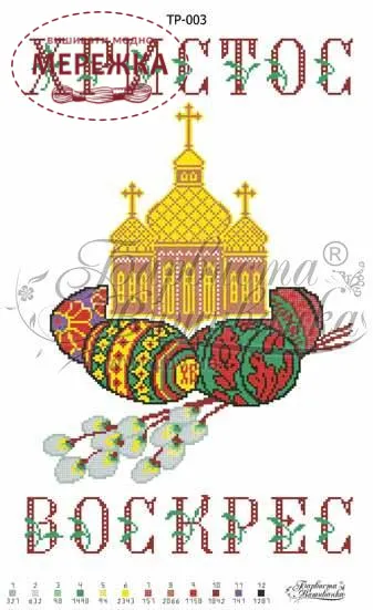 Схема для вишивання бісером великоднього рушника ТР003 від виробника "Барвиста вишиванка". З зображенням писанок та верби на фоні церкви.