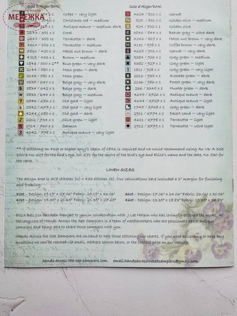Hands Across The Sea Samplers Limited - це студія дизайну, яку заснували дві подруги. Студія спеціалізується на відтворенні вишуканих антикварних взірців вишивки з музейних зразків.