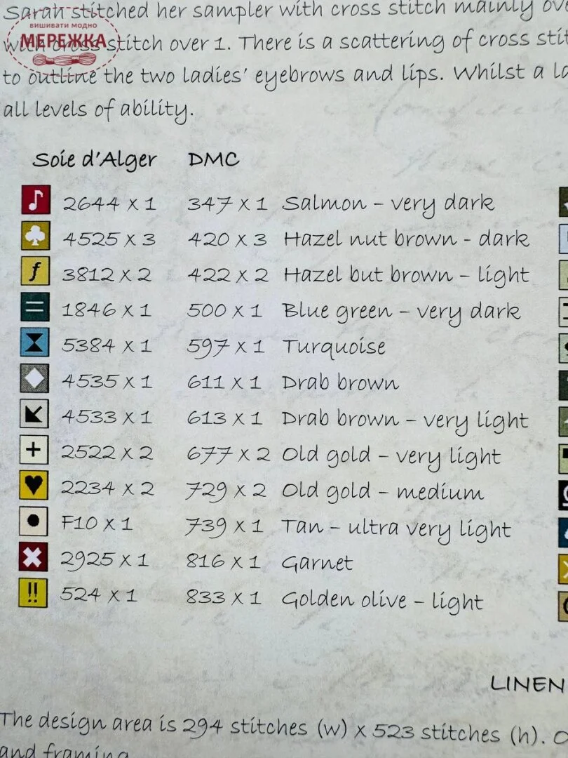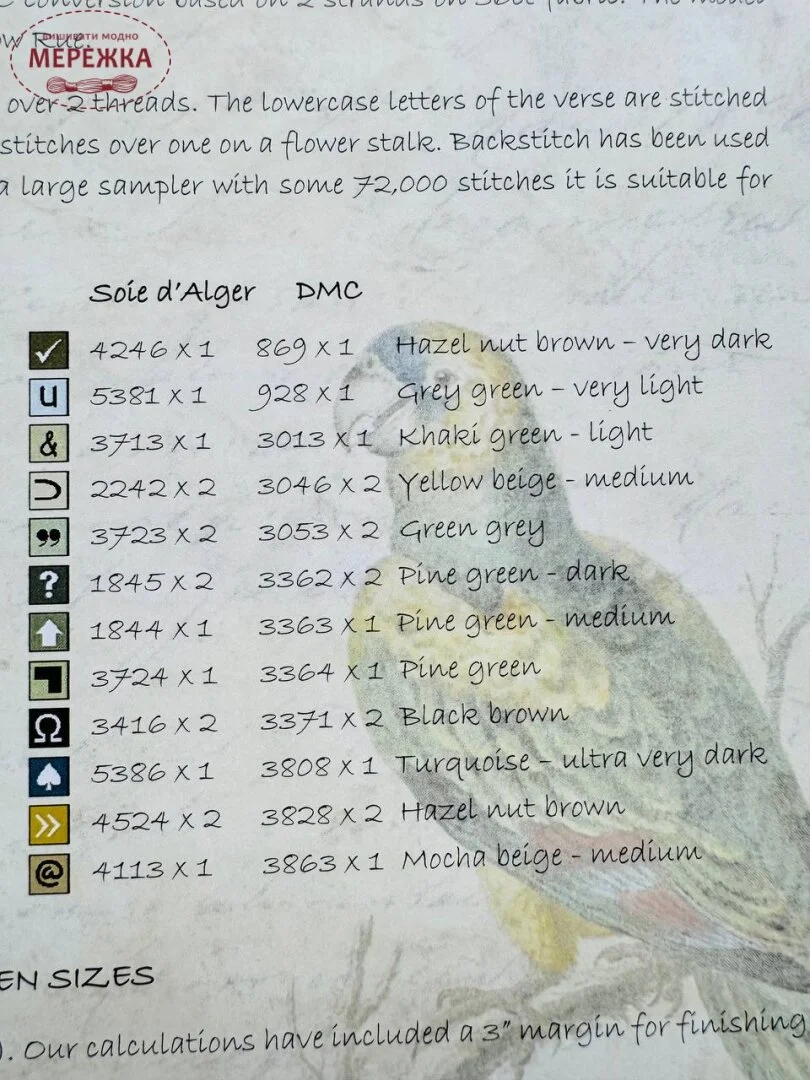 В даній схемі використовуються шовкові нитки Au Ver A Soie «Soie D’Alger» та «Soie 100.3», але надається конвертація в муліне DMC.