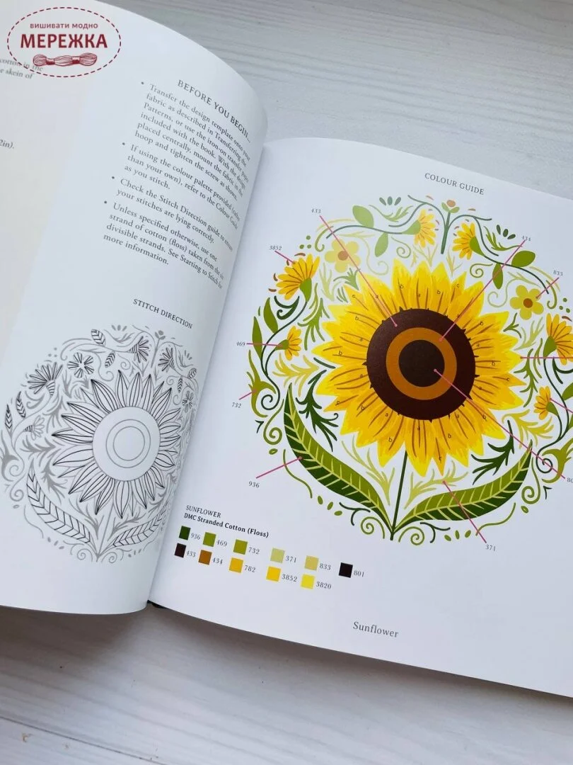 Натхненна природою та зміною пір року, Емілі створила п’ять нових та ексклюзивних візерунків для книги, чотири, які відображають кожну пору року по черзі, і один особливий дизайн, який об’єднує природний рік в одній яскравій вишивці.