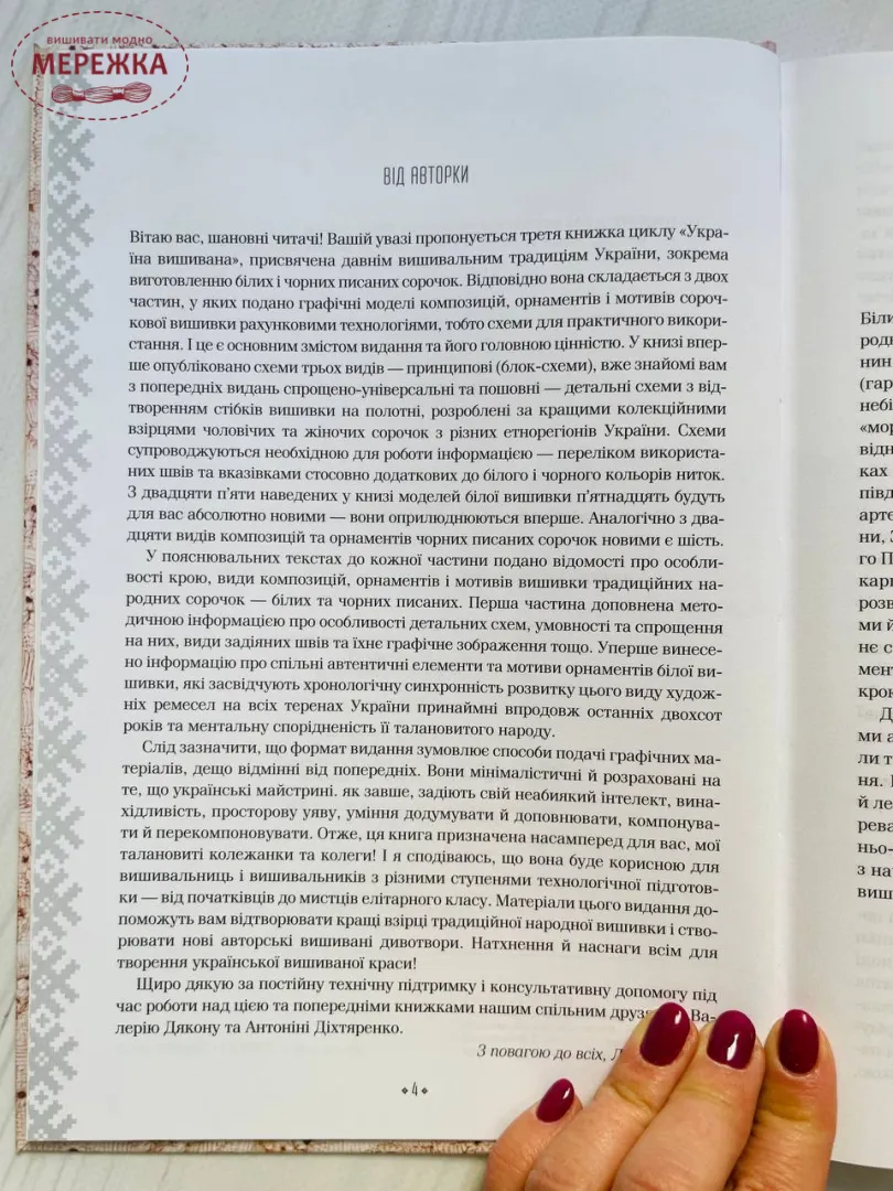 Візитівкою цього видання є чарівні білі та чорні писані сорочки з різних регіонів України, цікаві й самобутні за типами кроїв, колористикою вишивки, її компонуванням і технологіями виконання.