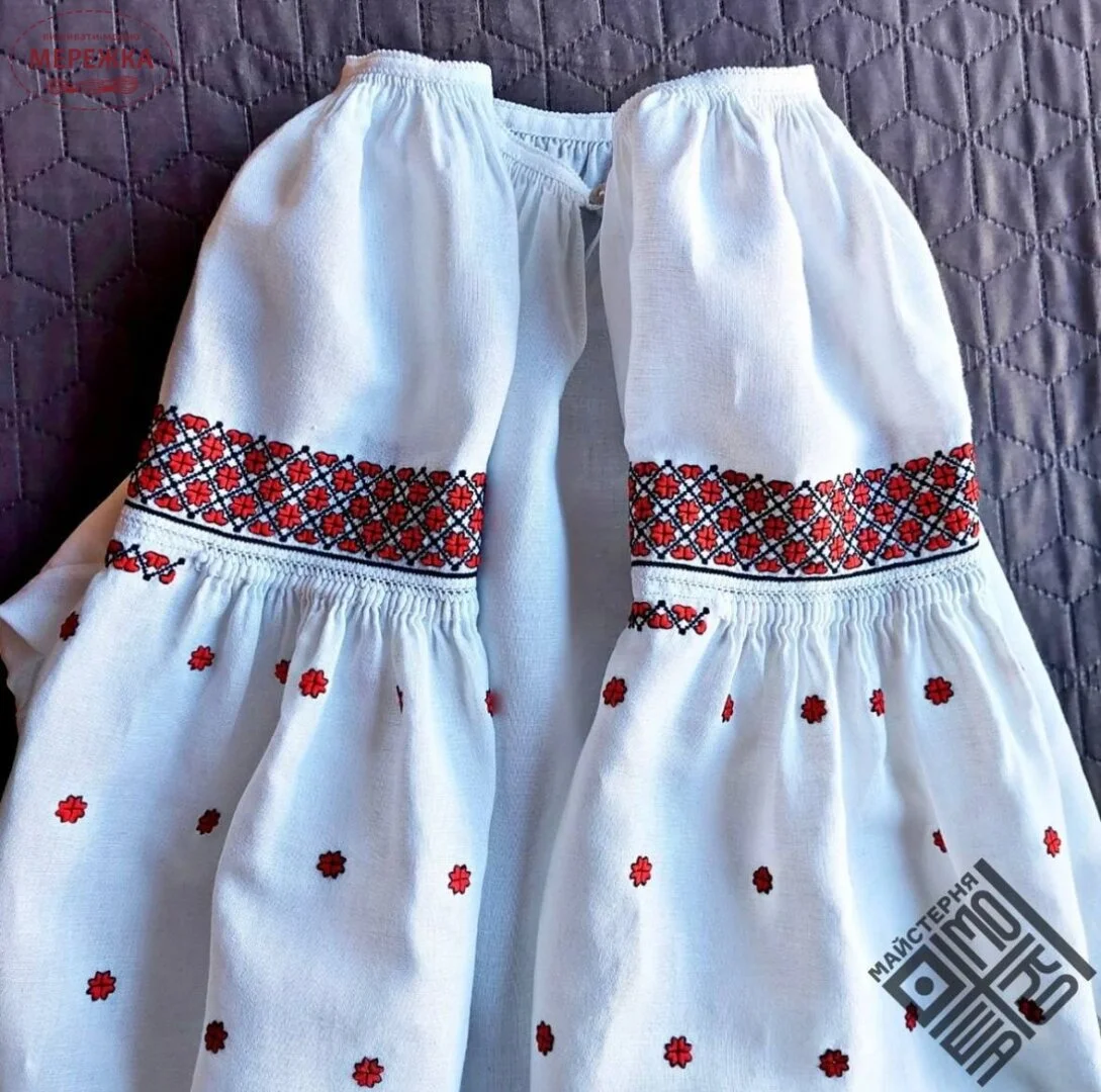 Уставка з рукавом змережані черв'ячком, вся сорочки зшита швом вистіг.