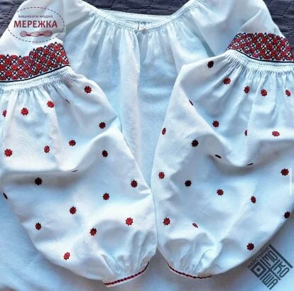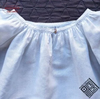 Горловина оздоблена зубцюванням, на рукаві пухлики, пазушний розріз виконаний крапелькою, низ сорочки підігнутий прутиком.