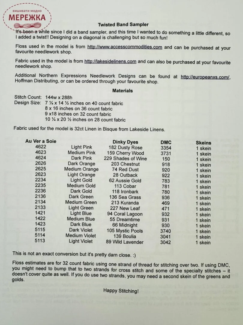 Схема для вишивання від Northern Expressions Needlework "Twisted Band Sampler"+ шовкові нитки