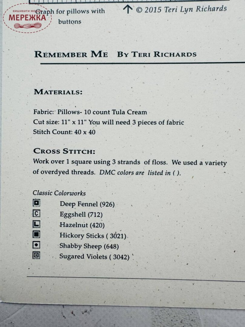 Всі необхідні матеріали (тканину та муліне) ви знайдете у нашому магазині. Якщо нитки від деяких виробників відсутні в нашому магазині, ми разом зможемо підібрати коректну заміну на муліне DMC.