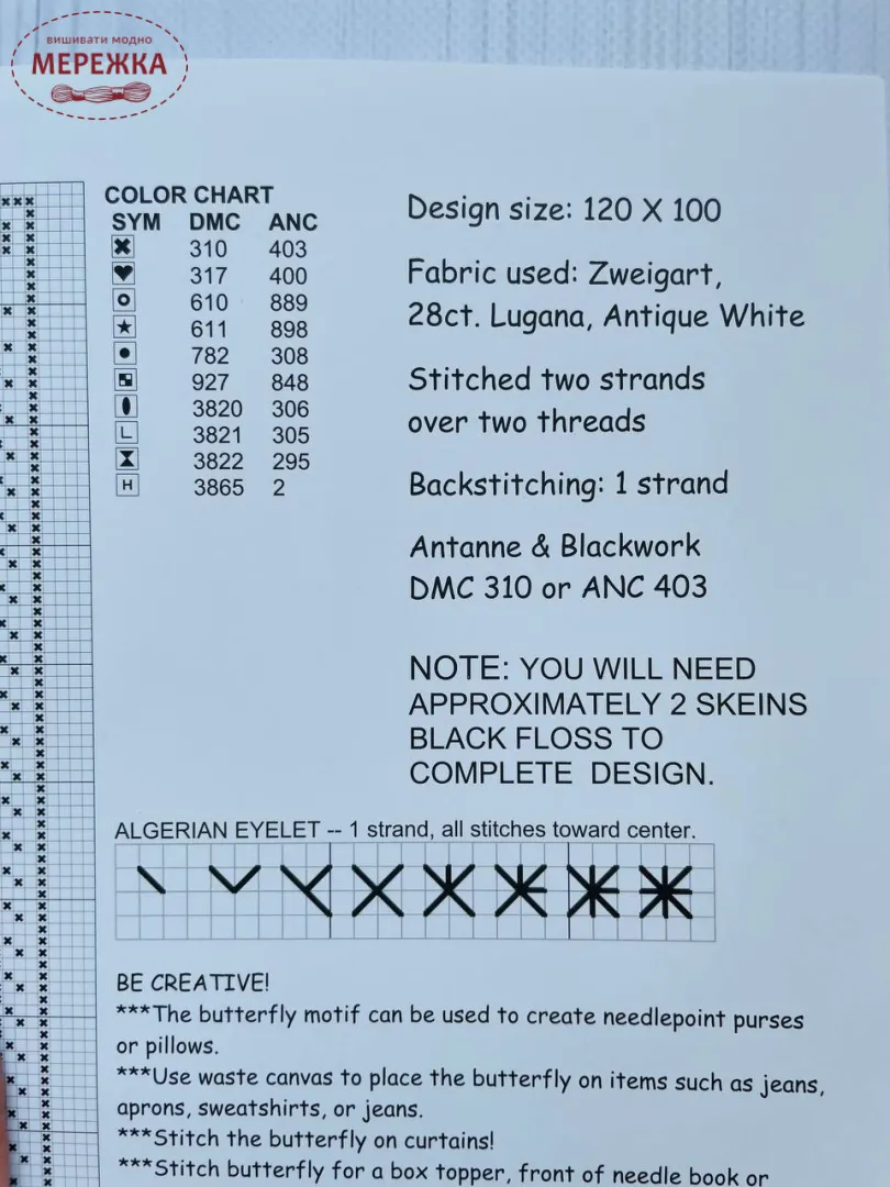 Рекомендовані нитки: DMC 310, 317. 610, 611, 782, 927, 3820, 3821, 3822, 3865.