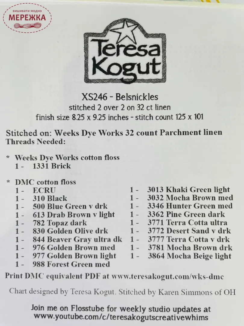 У схемах Терези Когут використовуються тканини та муліне від різних виробників (найчастіше Weeks Dye Works та DMC). Якщо ці матеріали відсутні в нашому магазині, ми разом зможемо підібрати коректну заміну на муліне DMC, що її пропонує автор в своїх схемах.