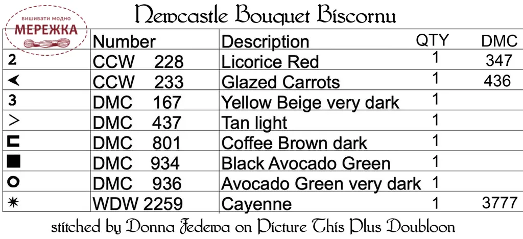 Рекомендовані нитки: CCW Licorice Red, Glazed Carrots; WDW Cayenne; DMC 167, 437, 801, 934, 936.